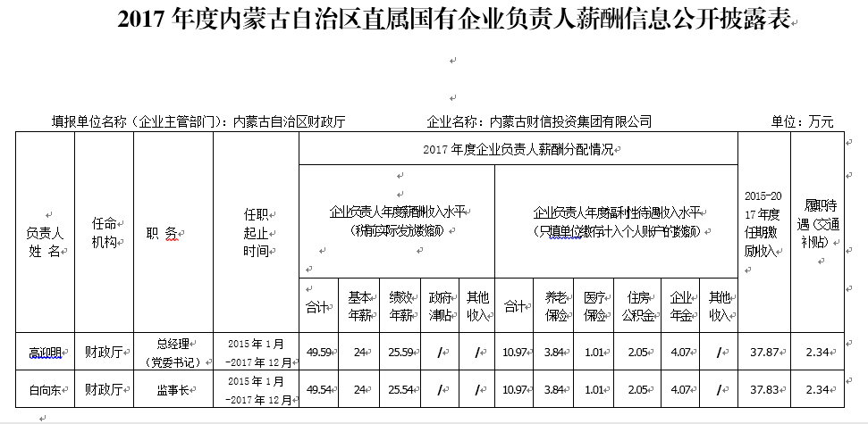 2017年度內(nèi)蒙古自治區(qū)直屬國有企業(yè)負責人薪酬信息公開披露表